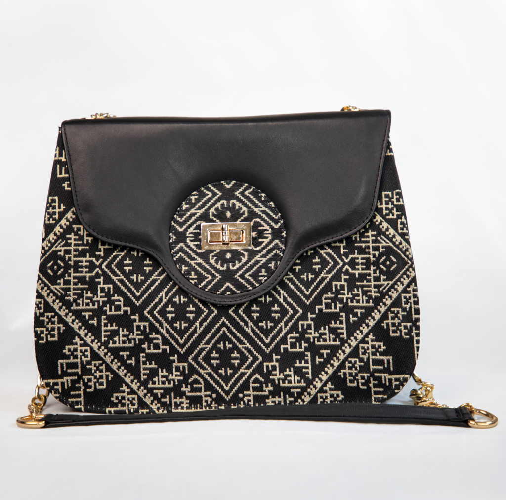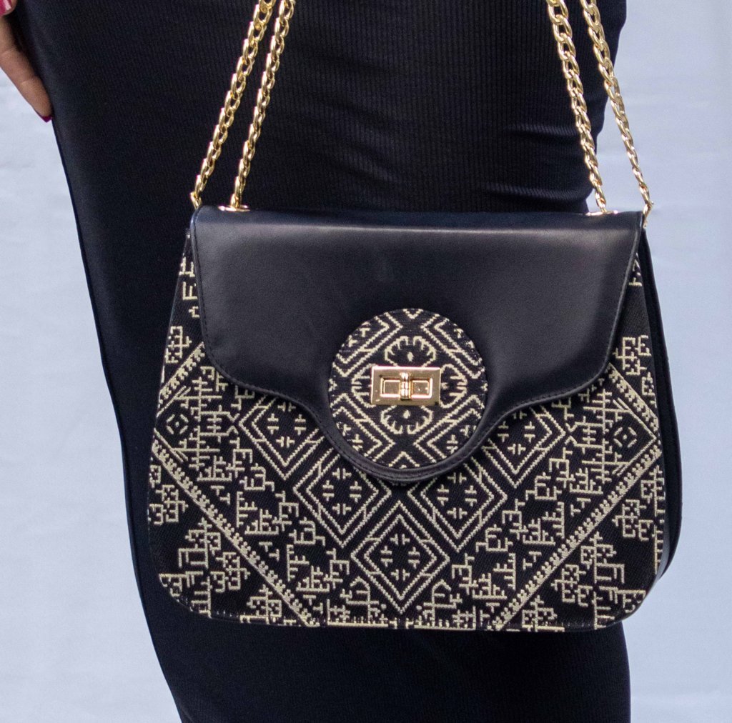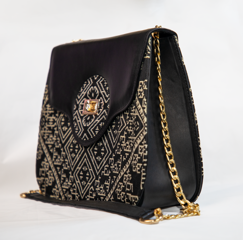 Son rabat en cuir véritable noir contraste élégamment avec le tissu brodé de motifs Gharza d’inspiration amazighe, typiques des savoir-faire berbères.