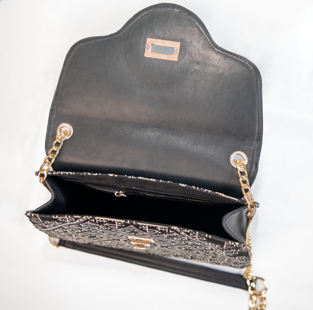 Élégance et identité berbère : Tazghart mêle cuir noir raffiné et broderie traditionnelle Gharza. Un sac unique, chic et profond.