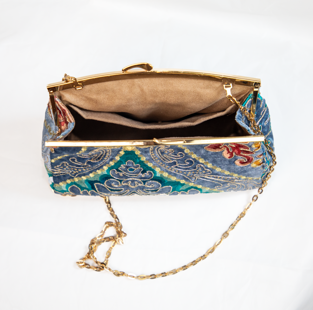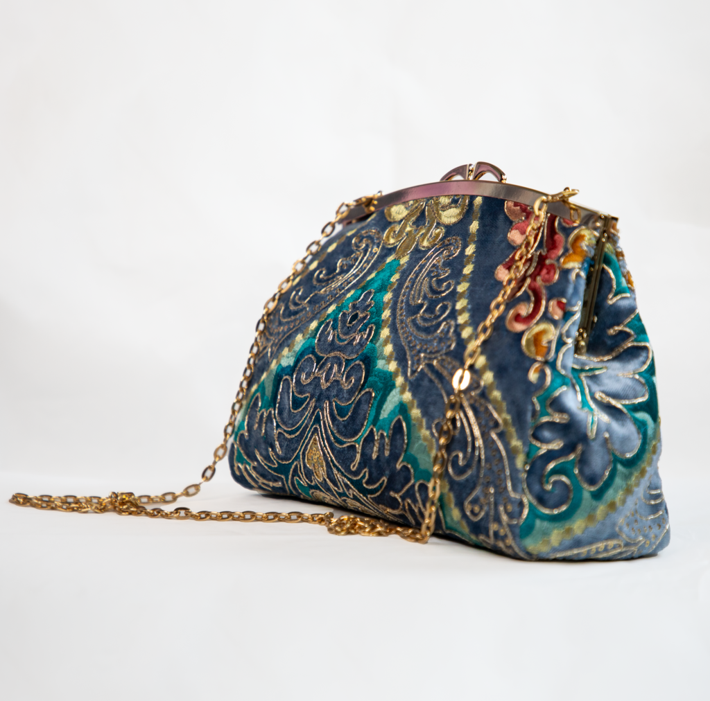 Un sac somptueux brodé de motifs orientaux multicolores sur velours bleu nuit. Une pièce maîtresse pour les grandes occasions.