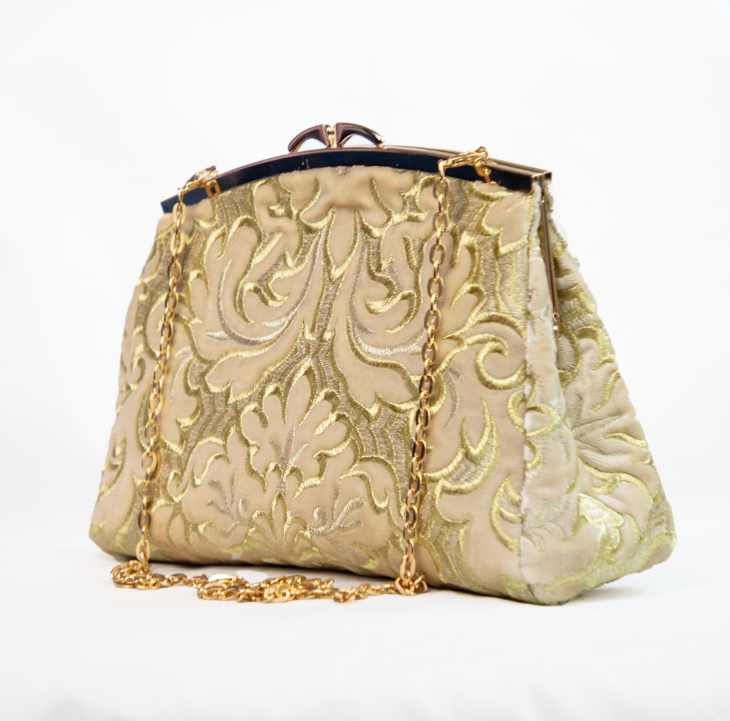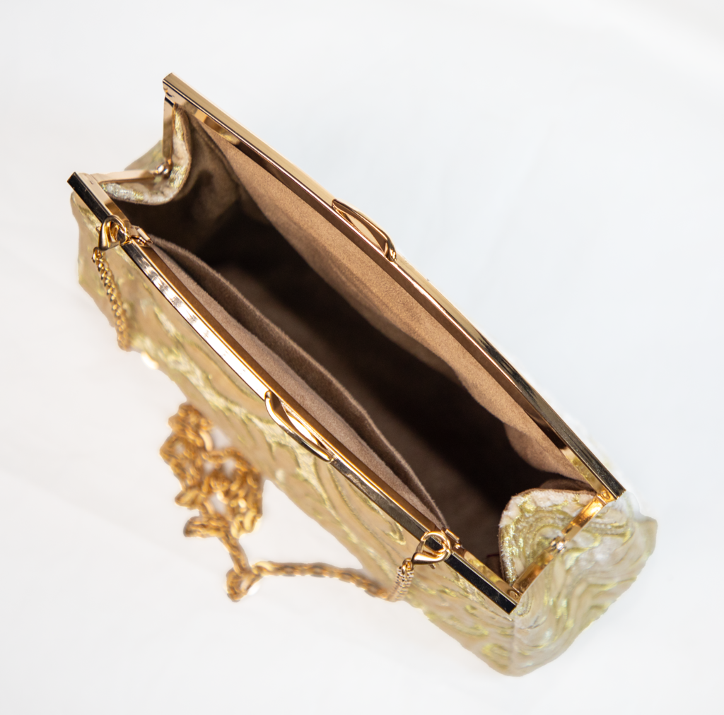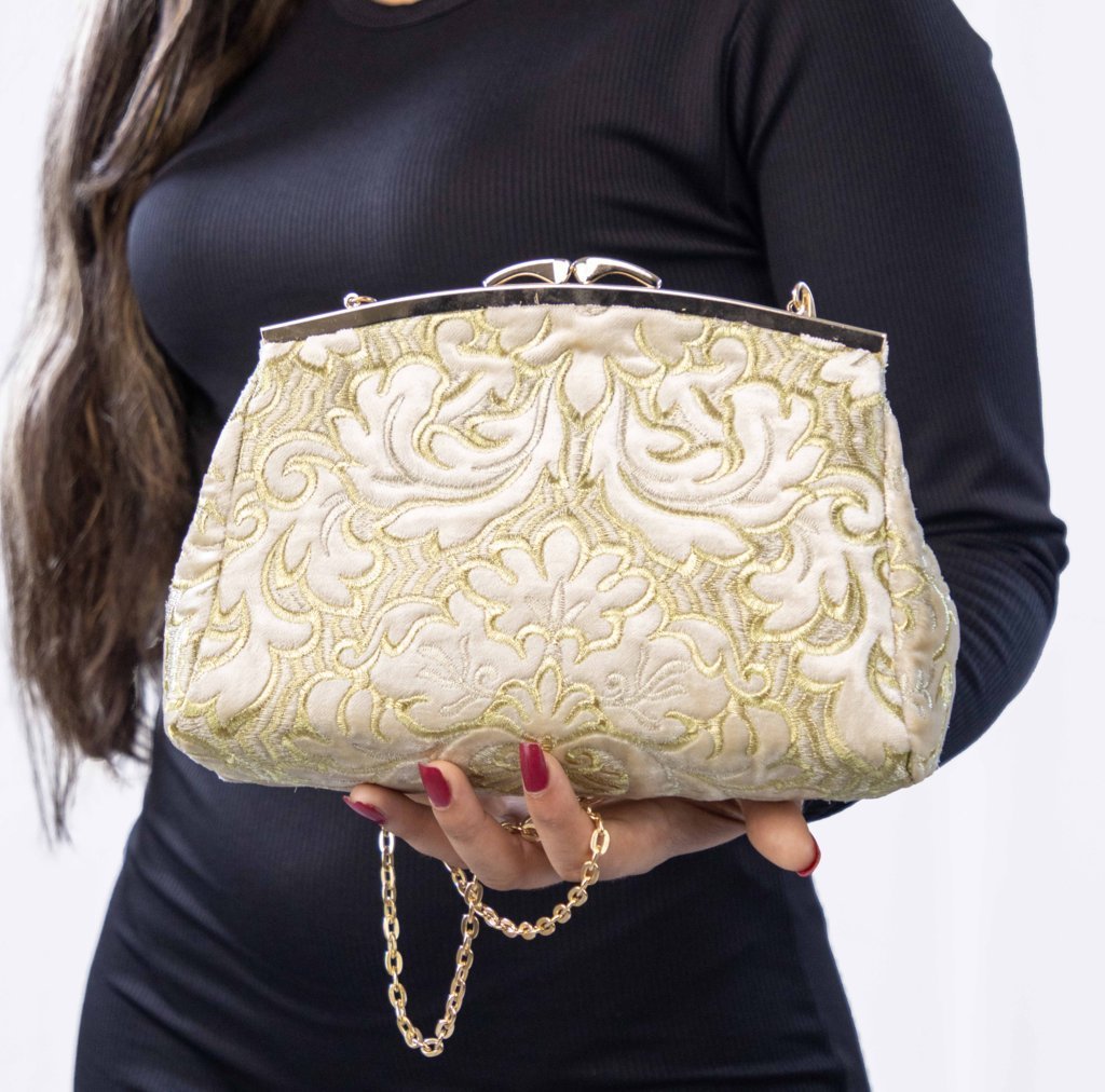 Élégance subtile et lumière naturelle : ce sac en velours beige brodé d’or est l’allié raffiné des tenues de cérémonie ou des soirées chics.