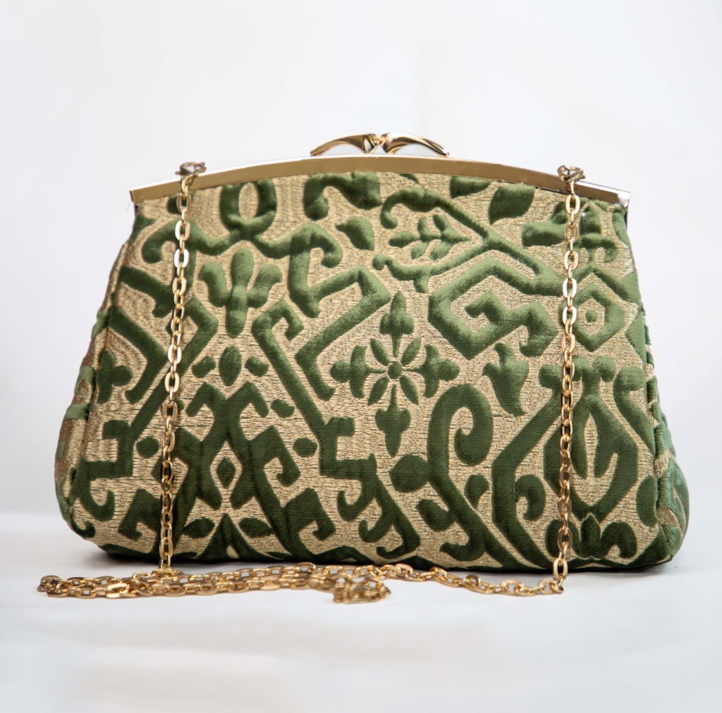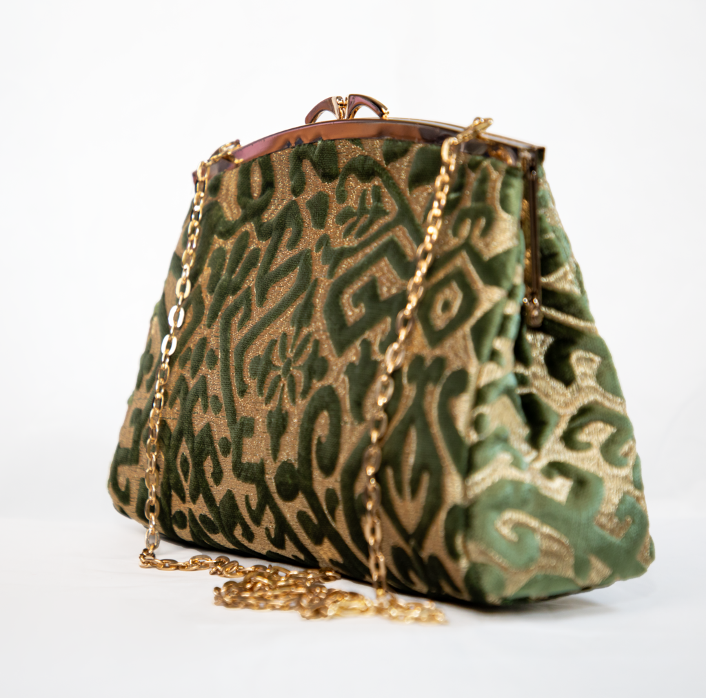 Majestueux et intemporel, le sac Z’man en velours vert profond et tissu doré lumineux met à l’honneur le style marocain avec une touche d’originalité.