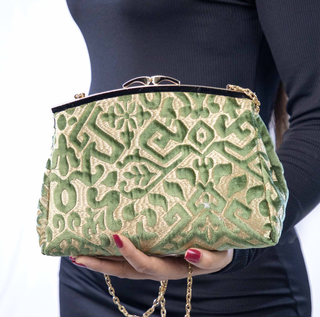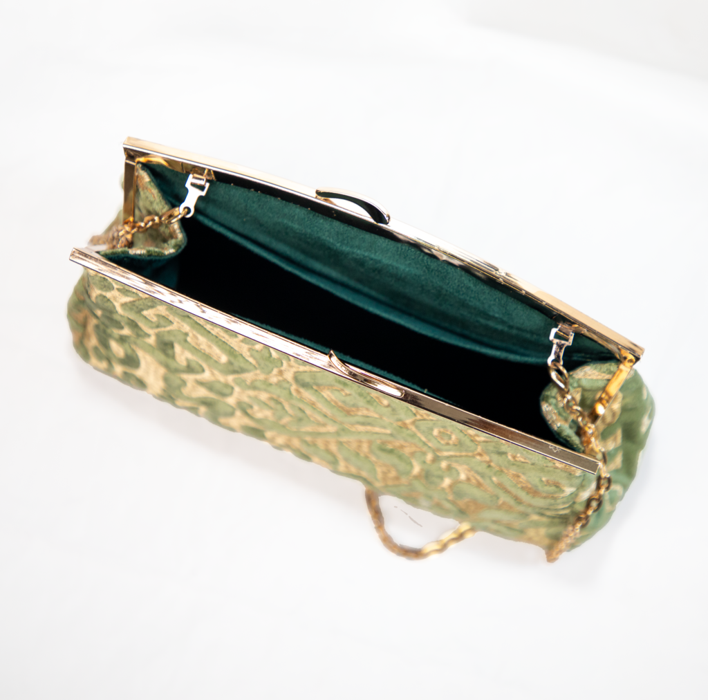 Ce sac Z’man en velours vert et tissu doré incarne le mariage raffiné de la tradition marocaine et de l’élégance naturelle.